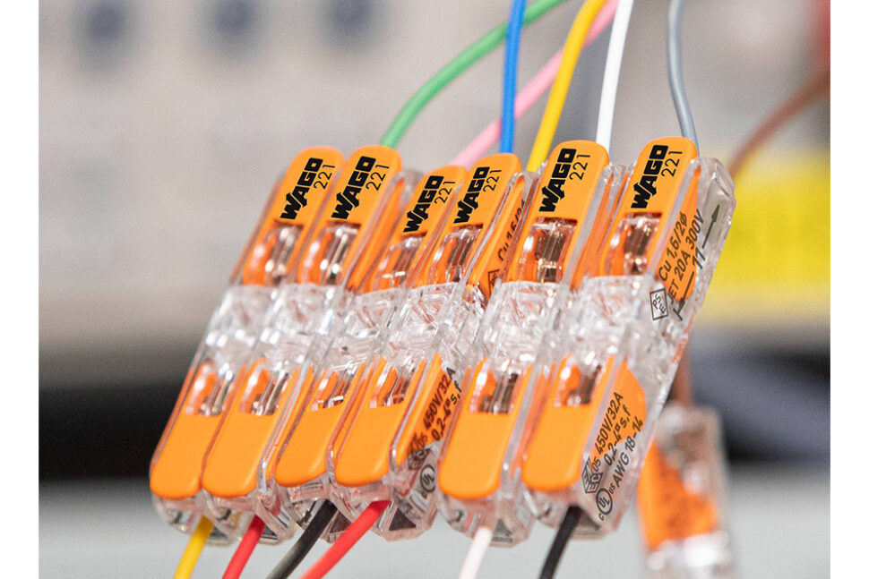 Wagos genomgångskontakter i serie 221 passar en-, fin- och flertrådiga ledare från 0,2 till 4 kvadrat. Finessen med de här kontakterna är att de har en manöverspak för att lätt ansluta och koppla bort den anslutna kabeln.