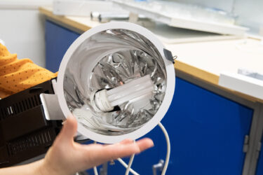 Exakt vad som testas beror på vilken armatur det är. Daniel Järpehult visar en återbruksprodukt där inte bara stommen, utan även bländskyddet återanvänds. Det fungerar utmärkt vid bytet från lysrör till LED.