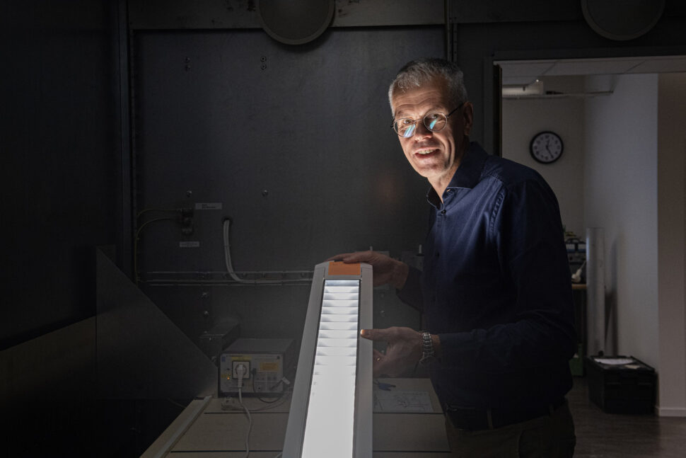 – Ofta vill kunden ha belysning som ger samma ljus som de äldre lysrören. Då vill vi veta hur mycket ljus den färdiga armaturen ger i varje riktning. Det mäter vi här, säger Daniel Järpehult.