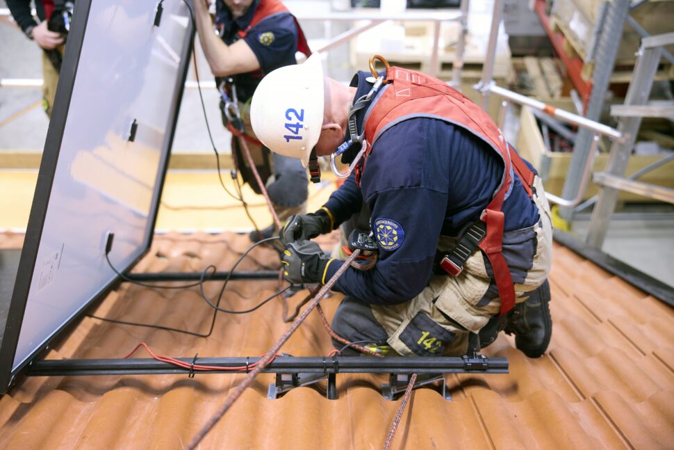 Under utbildningsdagen får brandmännen bland annat öva på att demontera solpaneler från ett tak inne i träningscentret. Att plocka bort solceller kan vara viktigt i vissa situationer. Till exempel om släckningen kräver att man tar upp hål i taket för att ventilera ut brandgaser.