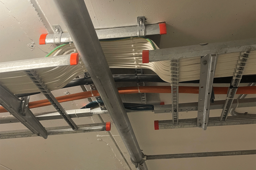 – Kabelstegarna brukar monteras innan undertaket. Men vid vårt senaste projekt var stommen för undertaket redan uppsatt och några plattor låg på plats. Vi fick krypa igenom undertaket och jobba därifrån, vilket var trångt och omständligt.