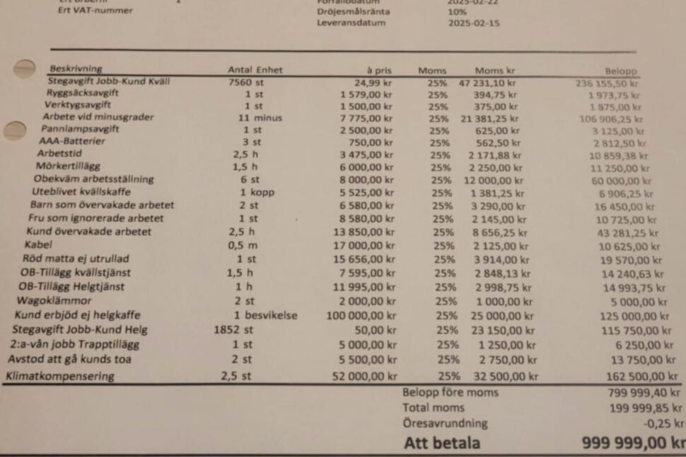 ”Såja! Nu känner man sig som en riktig elfirma! ”Prislistan matchar branschen – nu återstår bara registrering hos ESV. Saken gällde ju ändå att hjälpa en vän att byta två vägguttag som gått sönder.” Det skriver Ronnie Davidsson till en bild på den här rätt saftiga fakturan som han lade upp i Inget elfel, men…