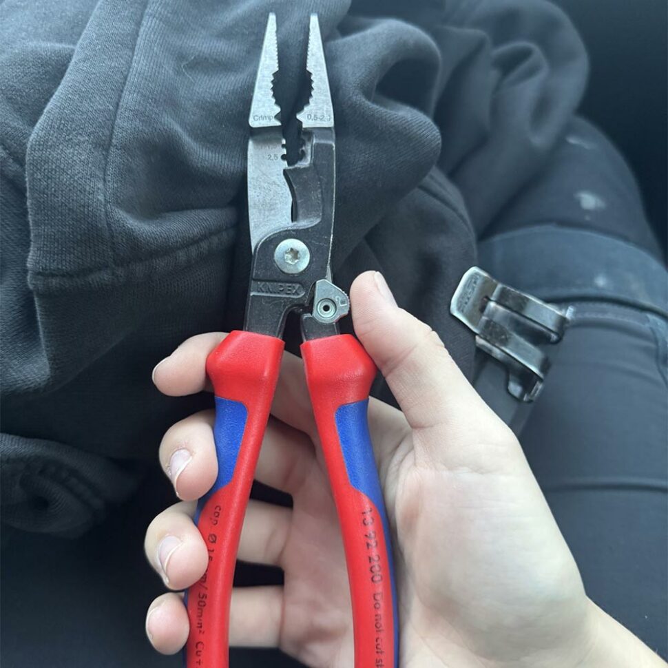 – Min elektrikertång från Knipex. Den fungerar som en plocktång och skaltång på samma gång. Skulle man dessutom råka klippa en spänningssatt kabel är tången isolerad och godkänd att använda för arbete med spänning.