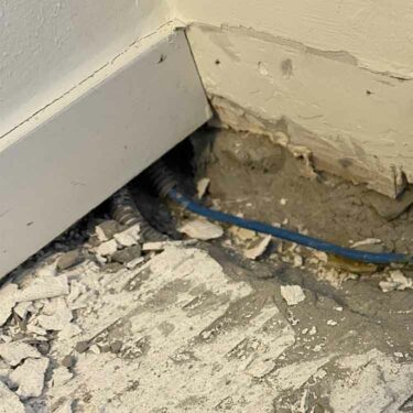 Här har kabeln kommit i kläm. En avstängningslist har satts in när golvet flytspacklats. Golvet har flytspacklats åt två håll i olika omgångar.