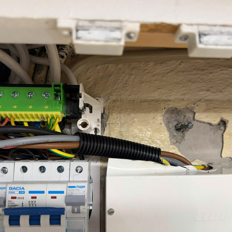 Inte heller fanns det någon gruppförteckning till centralen. Vid säkringarna stack det ut koppartrådar från fk-kablarna och matningen från elmätaren till centralen låg helt oskyddad.