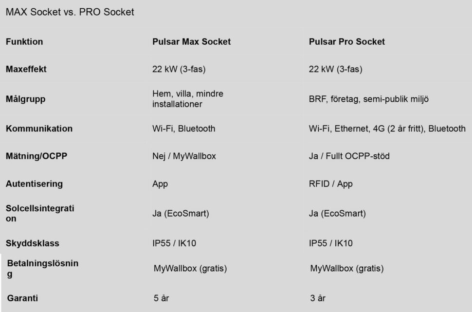 Våra mest populära laddare, Pulsar Max och Pulsar Pro, finns nu även utan fast kabel. Många installatörer har efterfrågat den här flexibiliteten. Med socket-variant kan kunden själv välja kabel och byta den i framtiden – utan att behöva byta hela boxen.